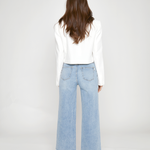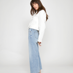 THE FIT: High rise, fitted through the hip, zipper fly, wide leg, and a cropped raw hem. THE FEEL: A structured cotton blend with enough stretch to hold you in while molding to your body over time. Runs small—size up for comfort.