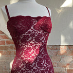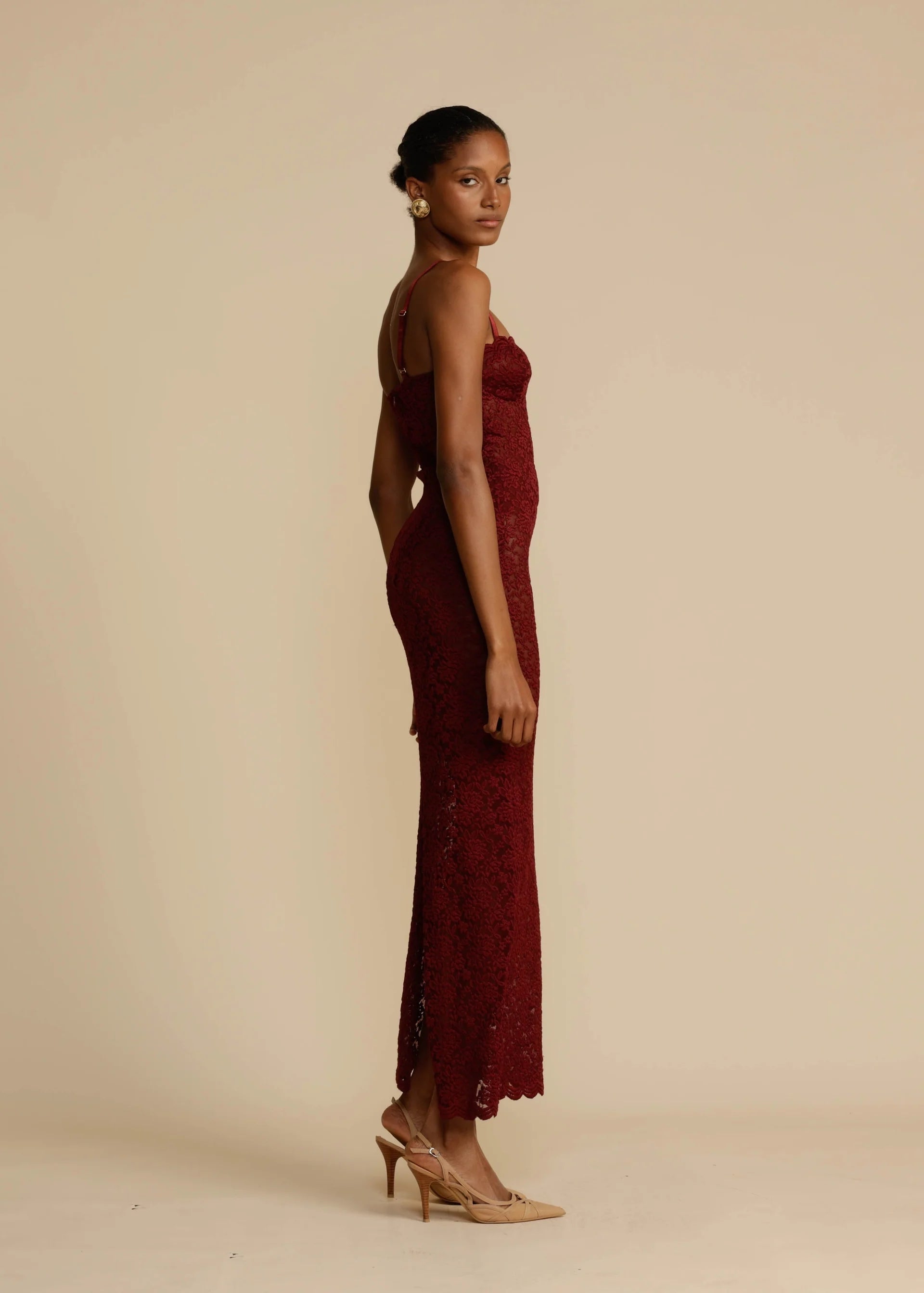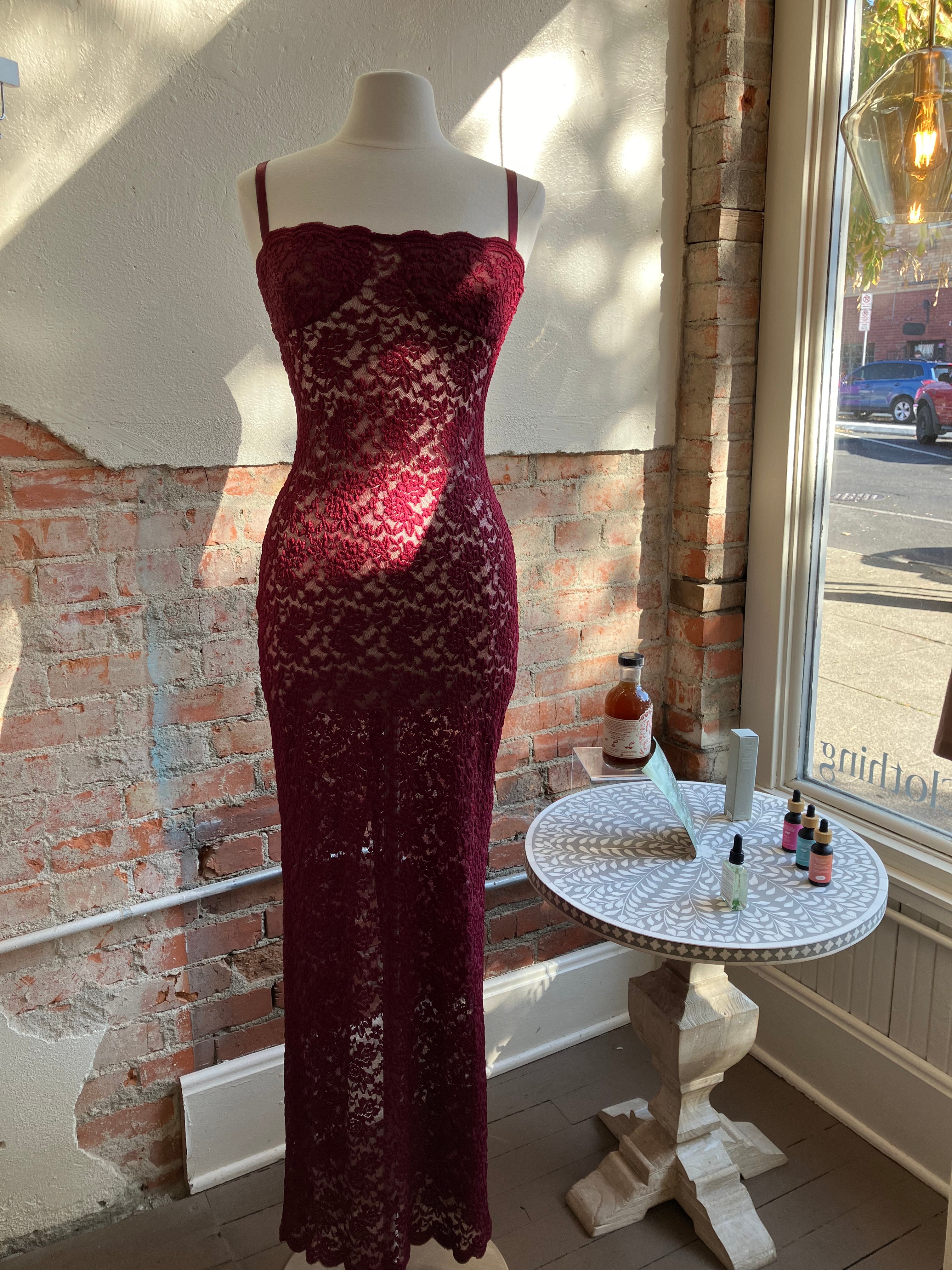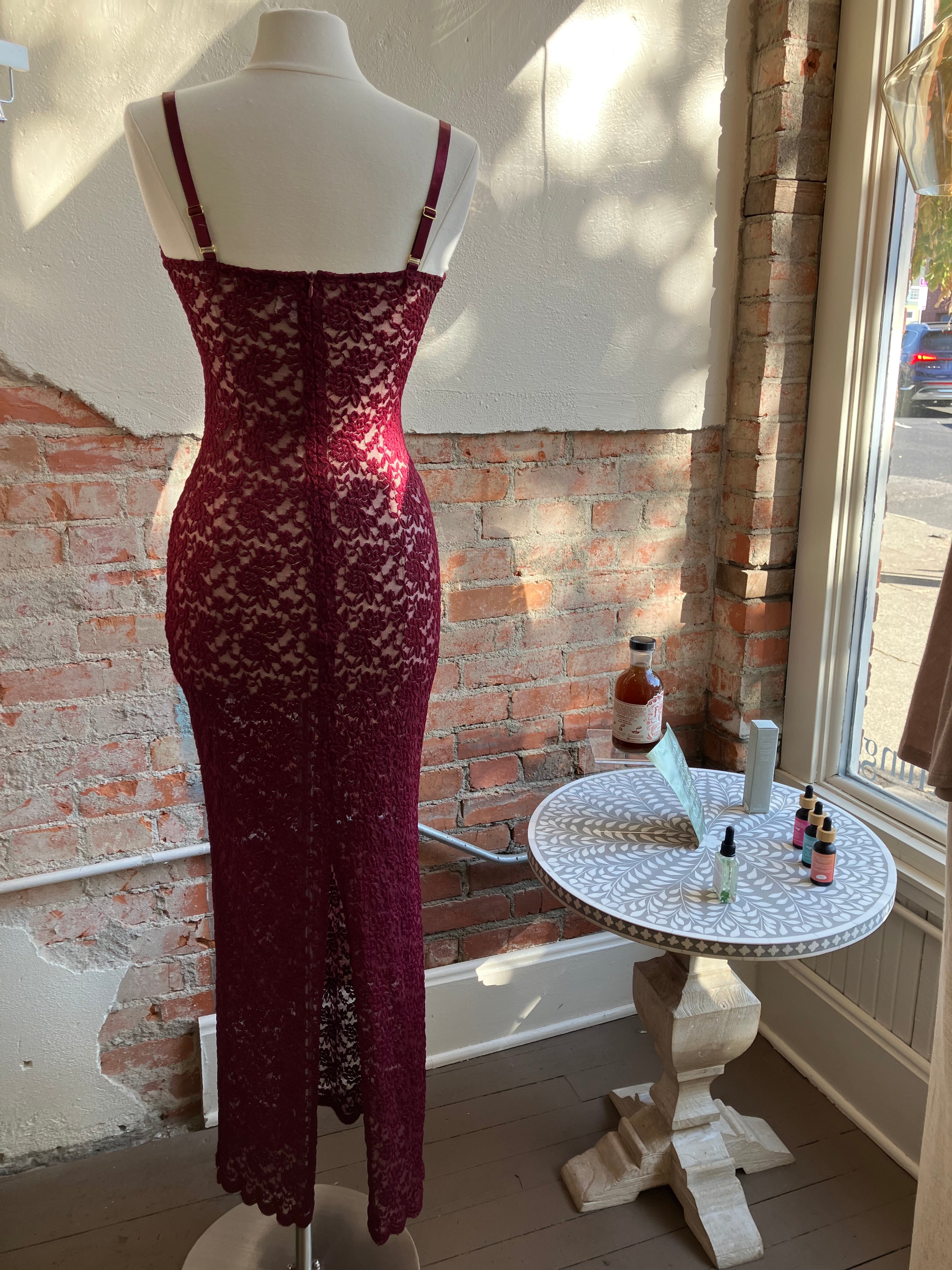 Step out in grace with Margot. Made from vintage-inspired lace with scalloped edges, new to Arcina Ori in a luxurious shade of deep Wine. She is the perfect balance between classic evening glamour and seductive allure. Designed to compliment the curves of your hips, before falling into a floor length maxi with a center back split. With comfort at core, adjust her using the gold fastenings on the shoulder straps. Complete with a semi-sweetheart neckline and lined at the bust for coverage and support. A timeless look that is elegantly sheer in finish, Margot will make you the belle of the ball.