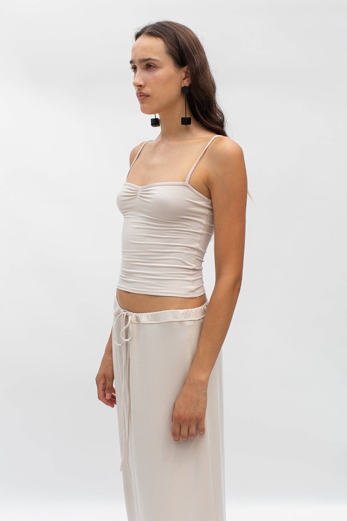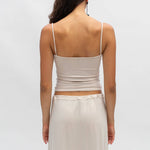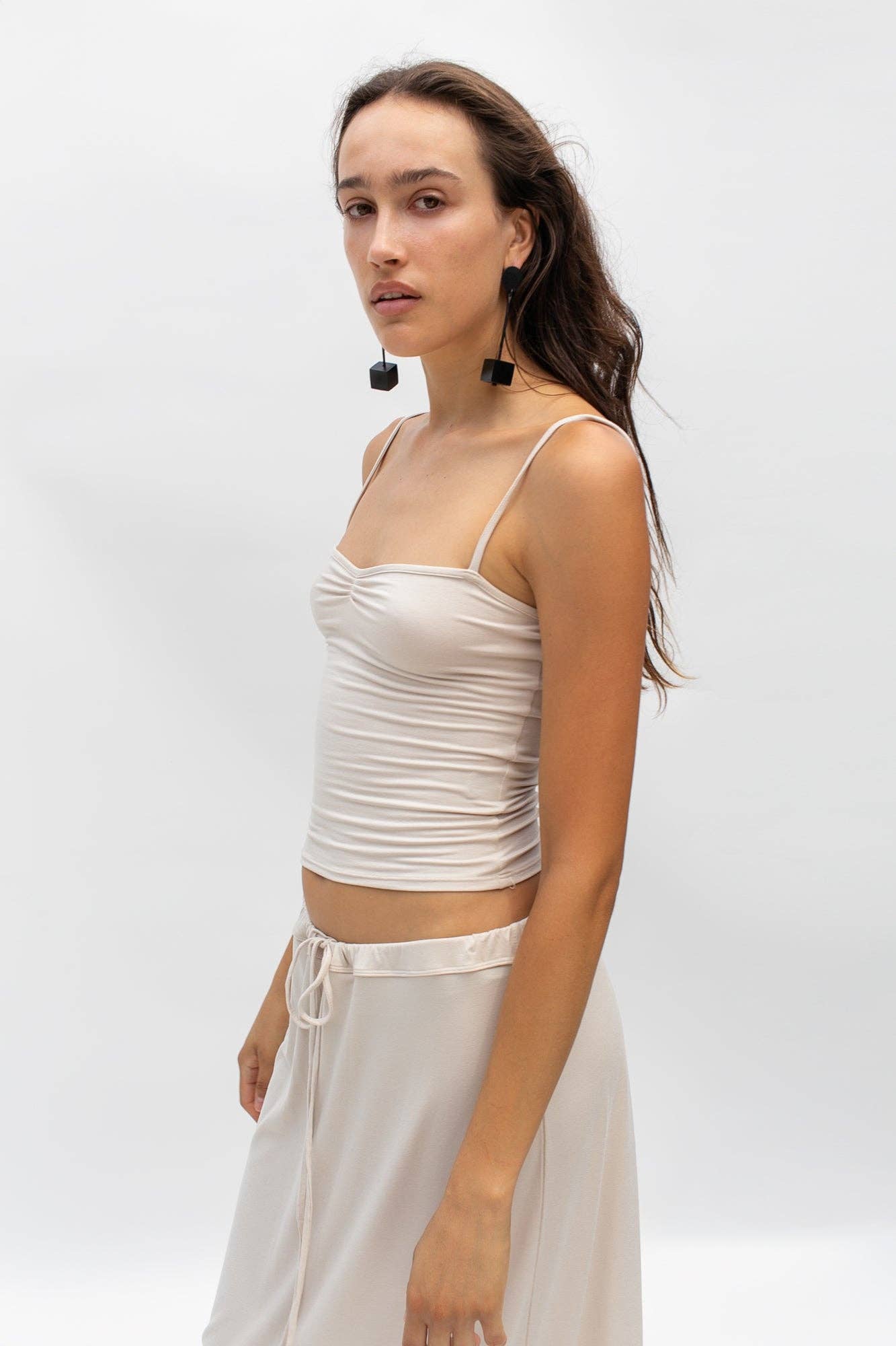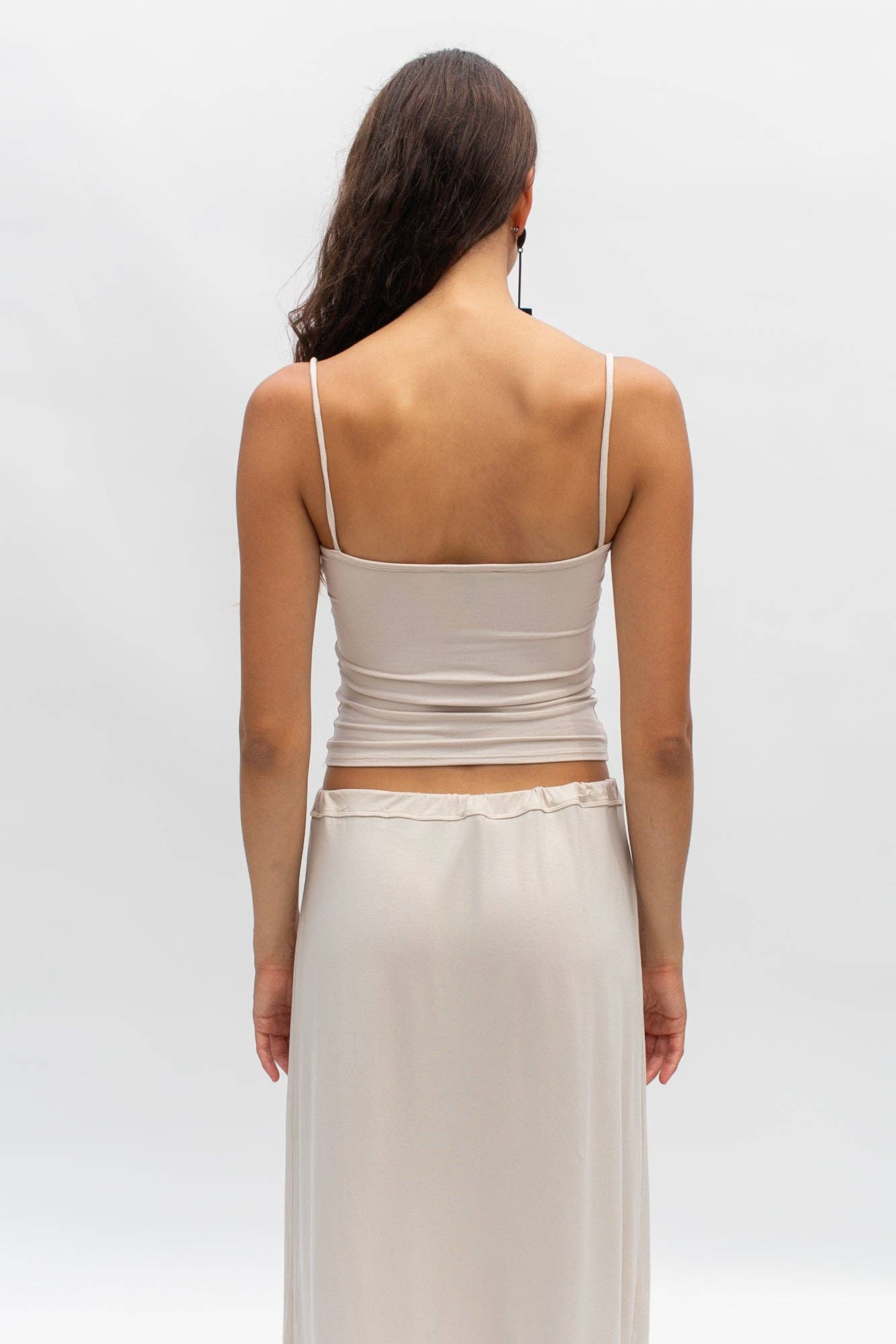 The Eva Top features a timeless silhouette with a sweetheart shaped neck line, spaghetti straps, and a fitted body and.