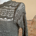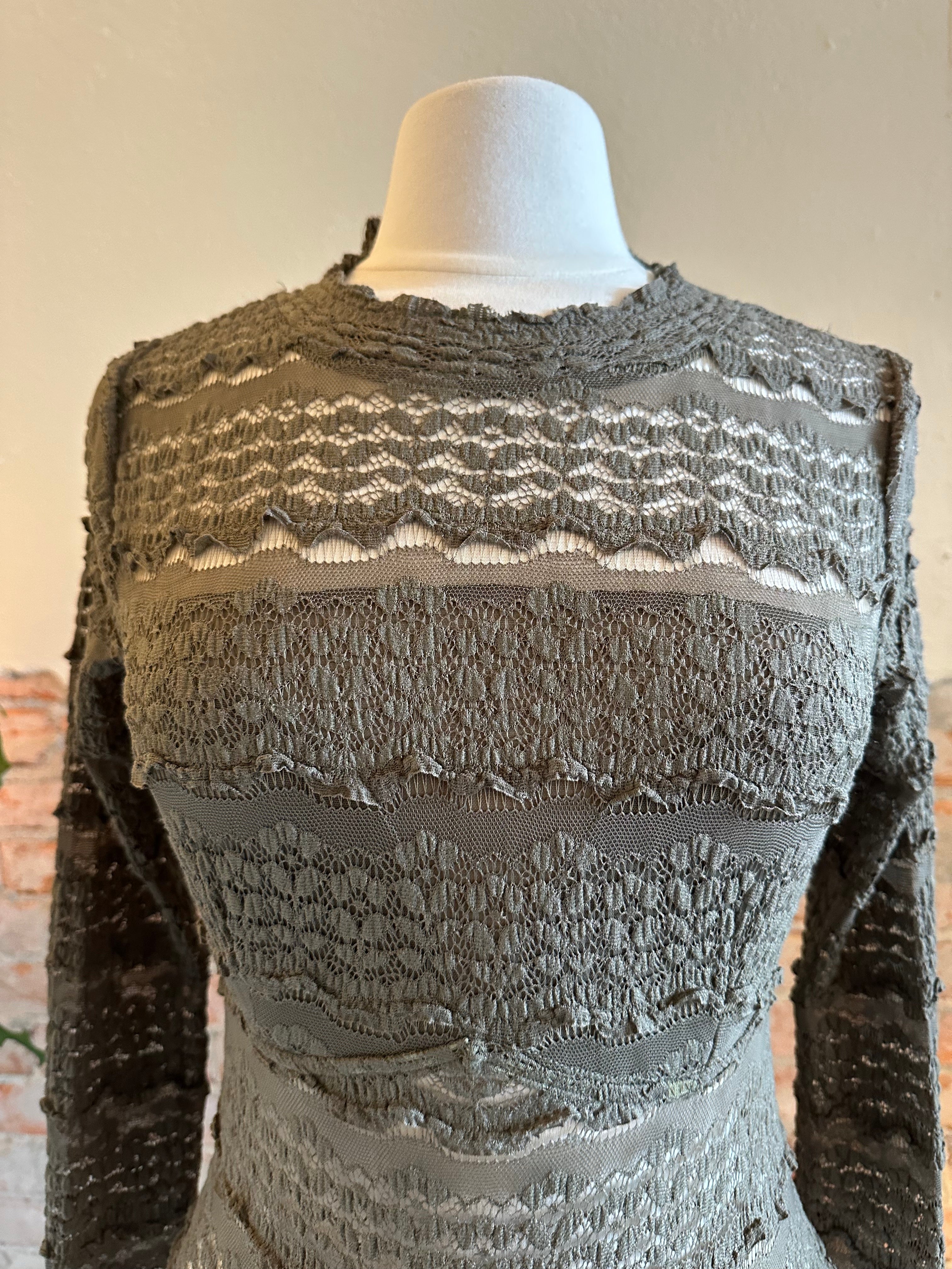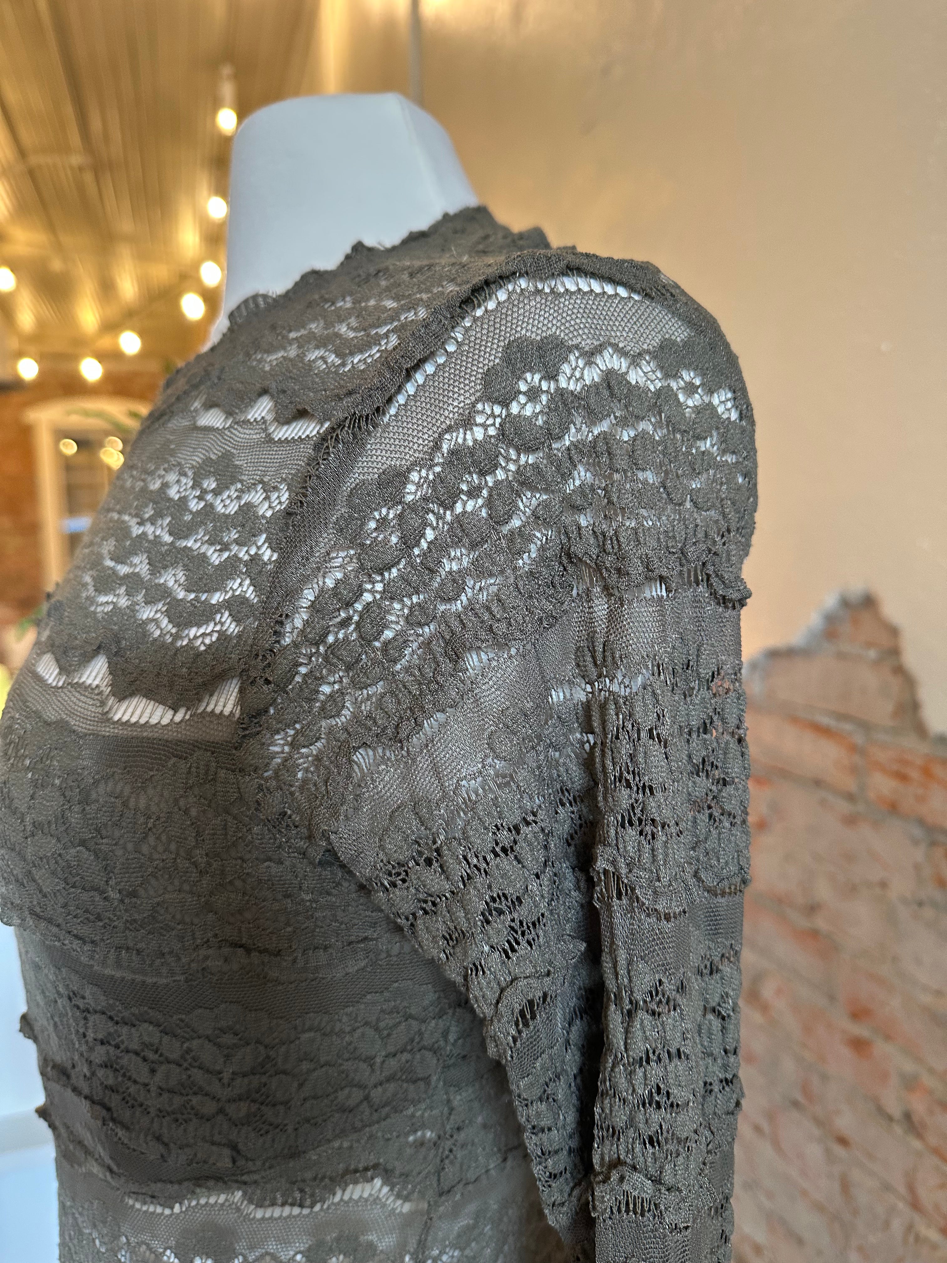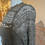 Features: Sheer lace fabrication, mock neckline, long fitted sleeves, lined bust, button closure at neck with cutout detail