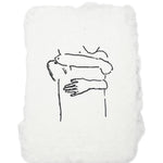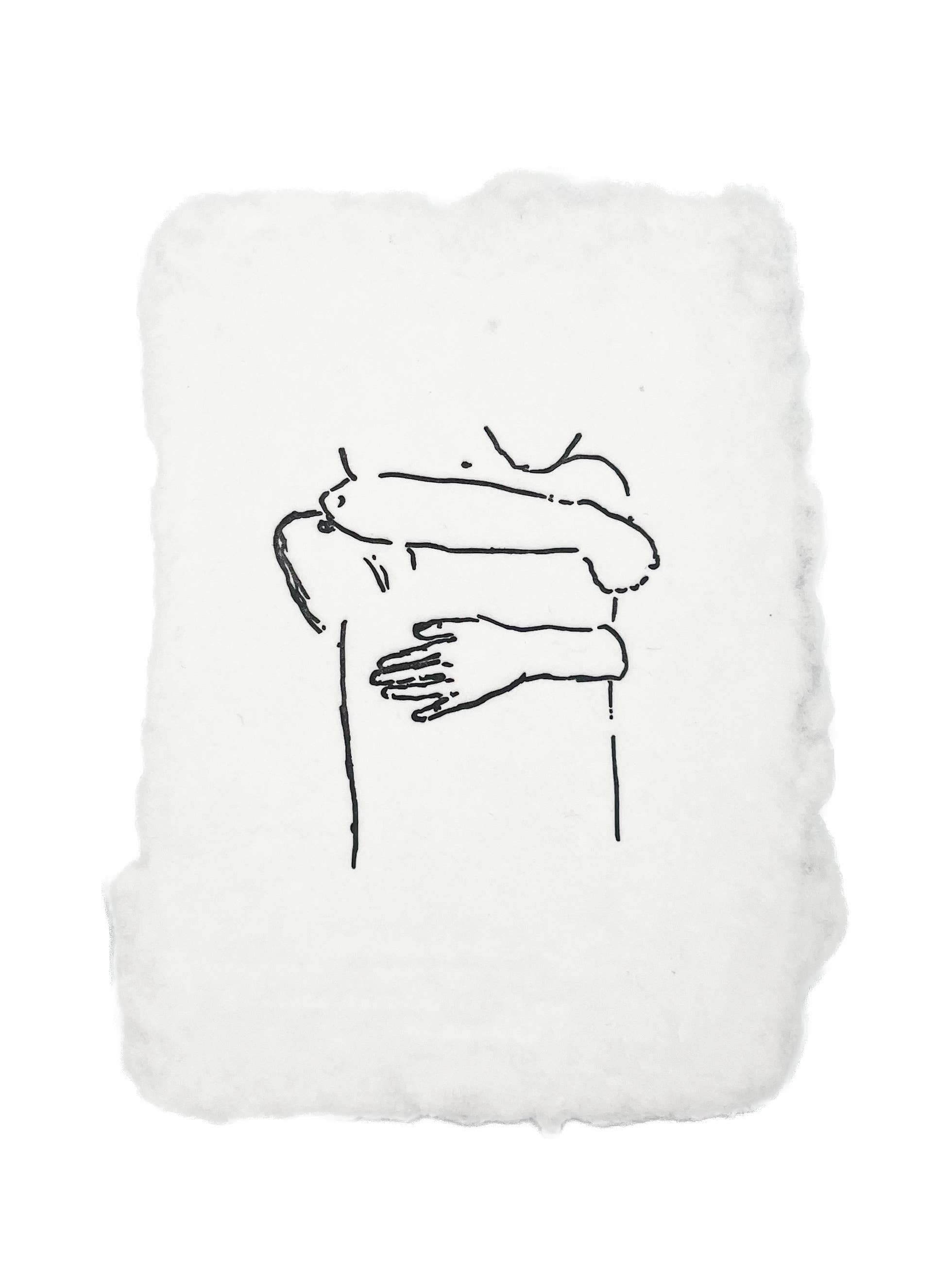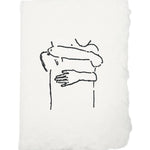White handmade paper with black letterpress ink featuring an illustration of two people embracing. Full deckle edge paper handmade in a California studio, hand-fed onto antique letterpresses for a textured deboss.