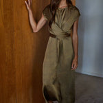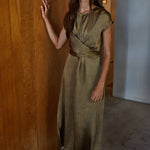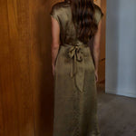 Olive Gold Woven Satin Cross Front Tie Strap Maxi