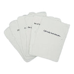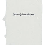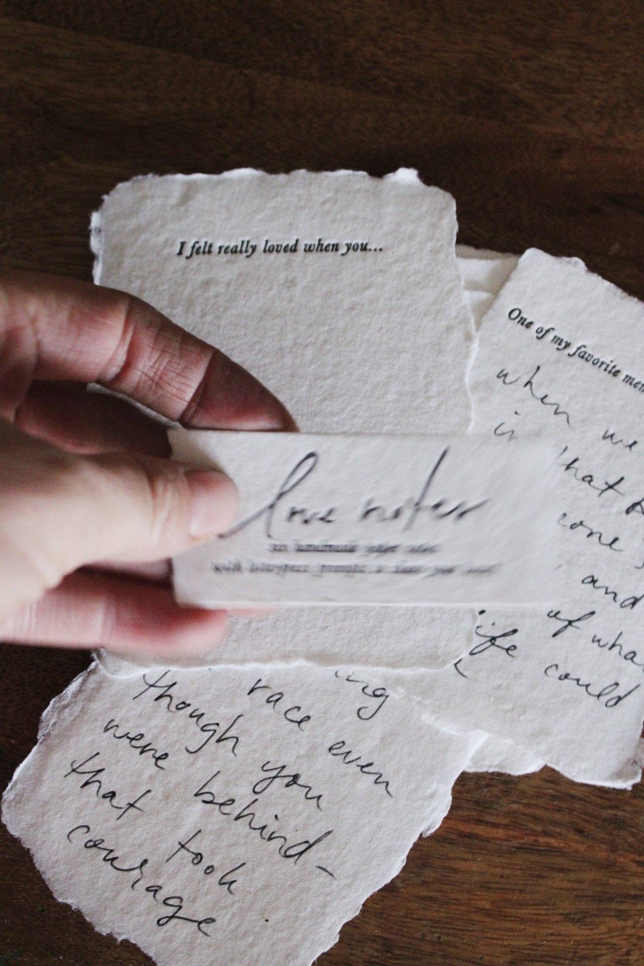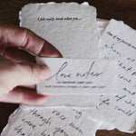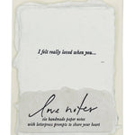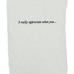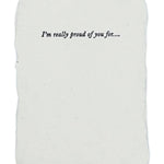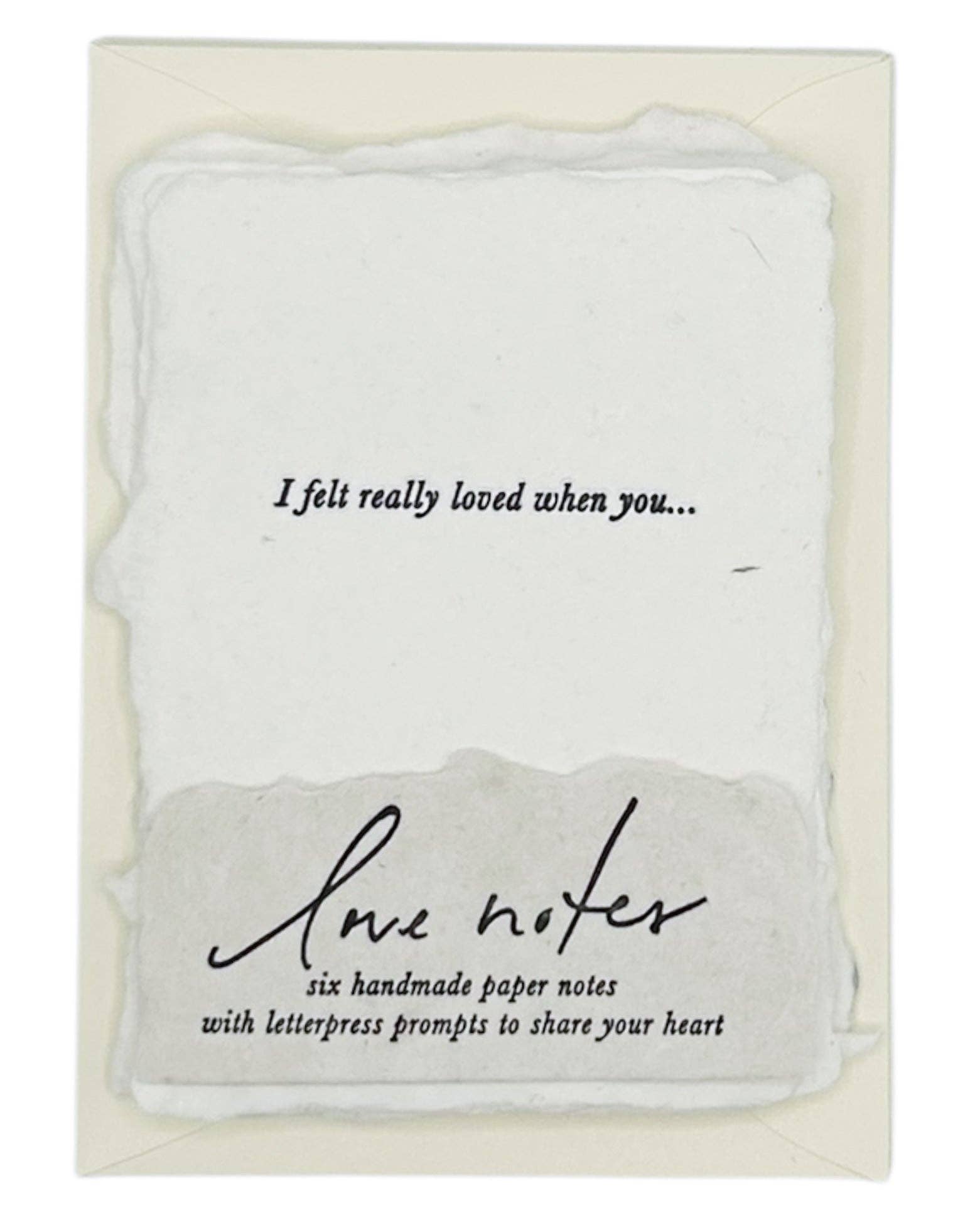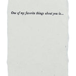 Full deckle edge soft white paper handmade in our California studio, hand-fed onto antique letterpresses for a textured deboss. Approximately 3 1/4 x 4 1/4 inches with off-white FSC certified envelopes. Six different phrases: One of my favorite things about you is… I really appreciate when you… One of my favorite memories with you is… I love the way you… I felt really loved when you… I’m really proud of you for…