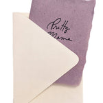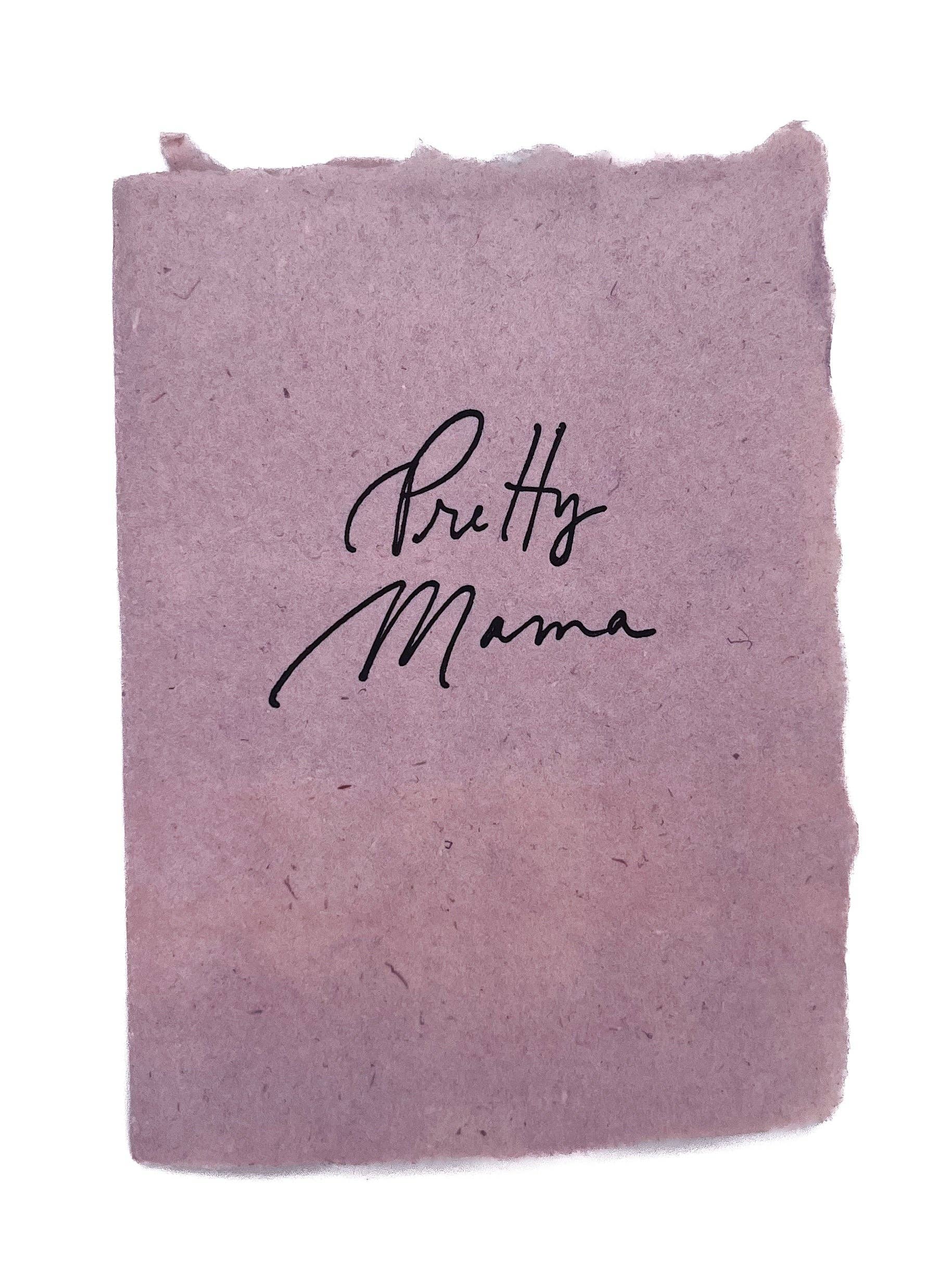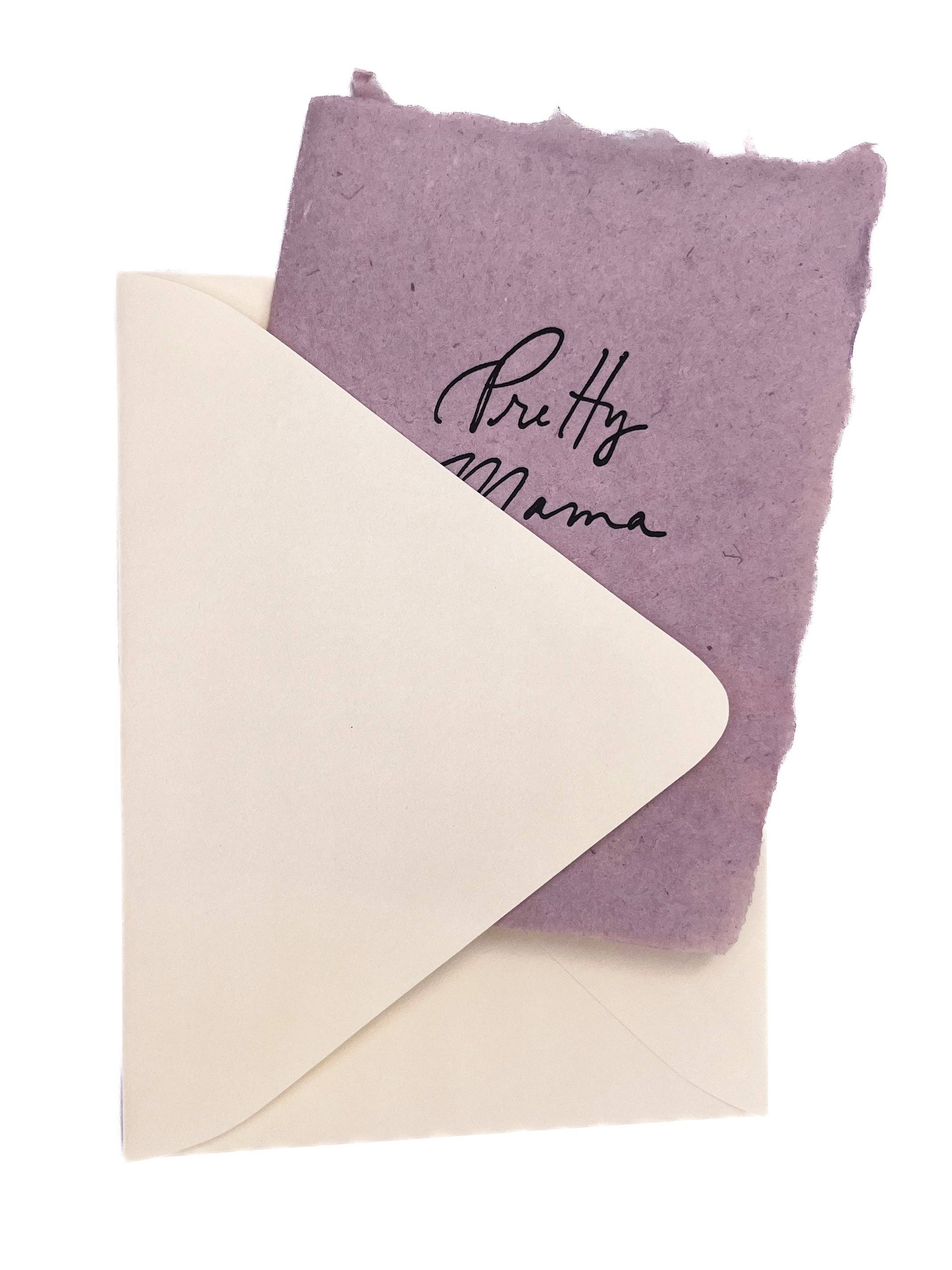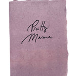 Mauve handmade paper with black letterpress that reads "Pretty Mama". Full deckle edge paper handmade in our California studio, hand-fed onto antique letterpresses for a textured deboss.